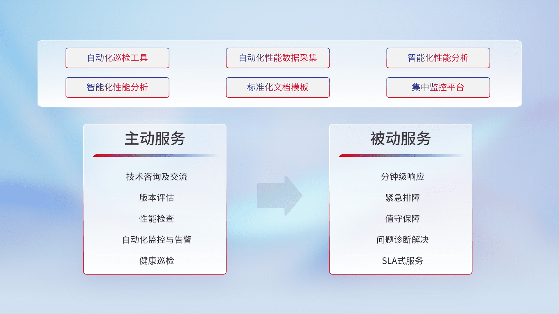 智能化工具和标准化文档,,,保障服务质量,,,提供主动服务(包含技术咨询、、版本评估、、、、性能检查、、、自动化监控与告警、、健康巡检)和被动服务包含(分钟级响应、、、、紧急排障、、值守保障、、、问题诊断解决、、、、SLA服务)。。